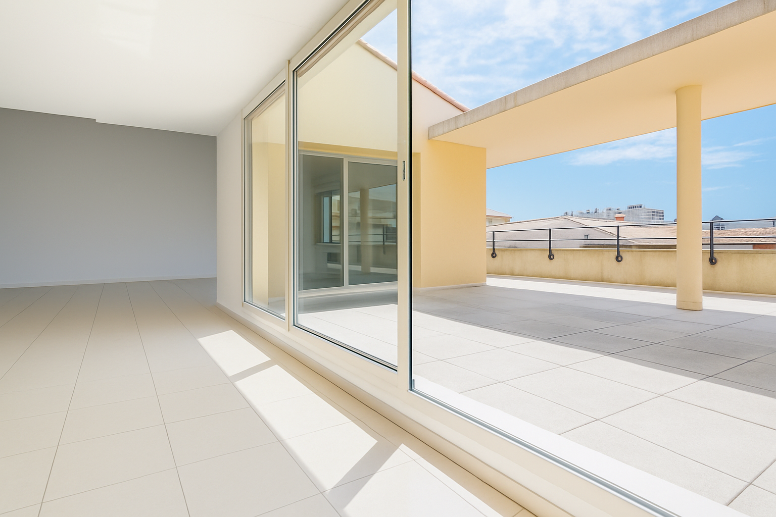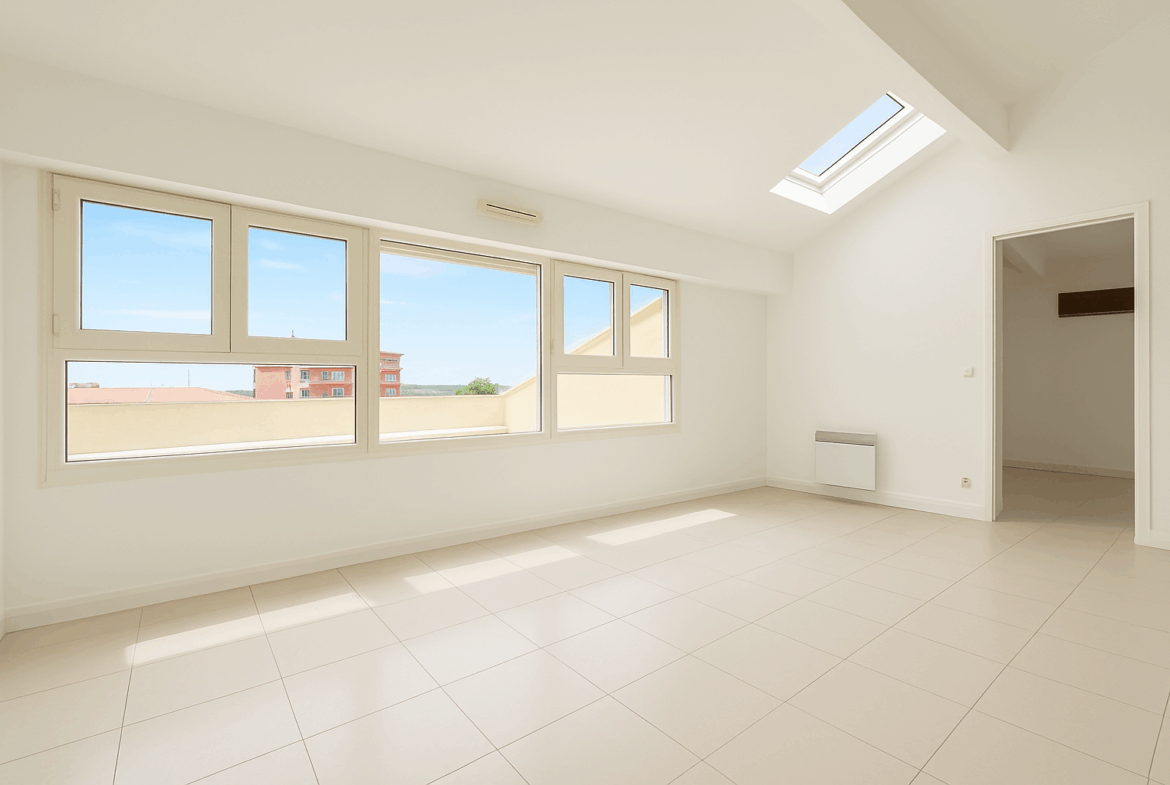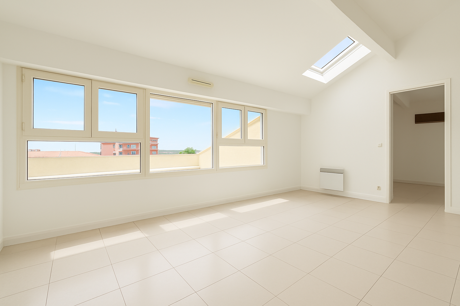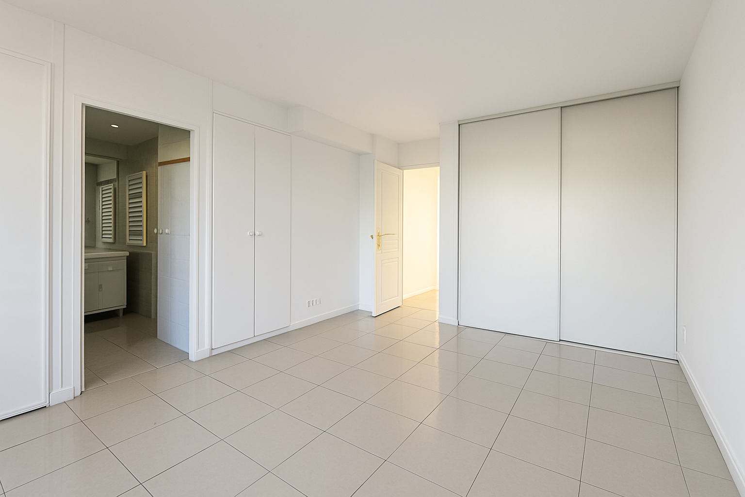 Accessible by elevator with direct access to the apartment, the apartment boasts double exposure and high ceilings. The vast cathedral living room of over 100 m², bathed in light, opens onto the terrace through large bay windows. The kitchen, open to the living space, creates a convivial, contemporary setting.