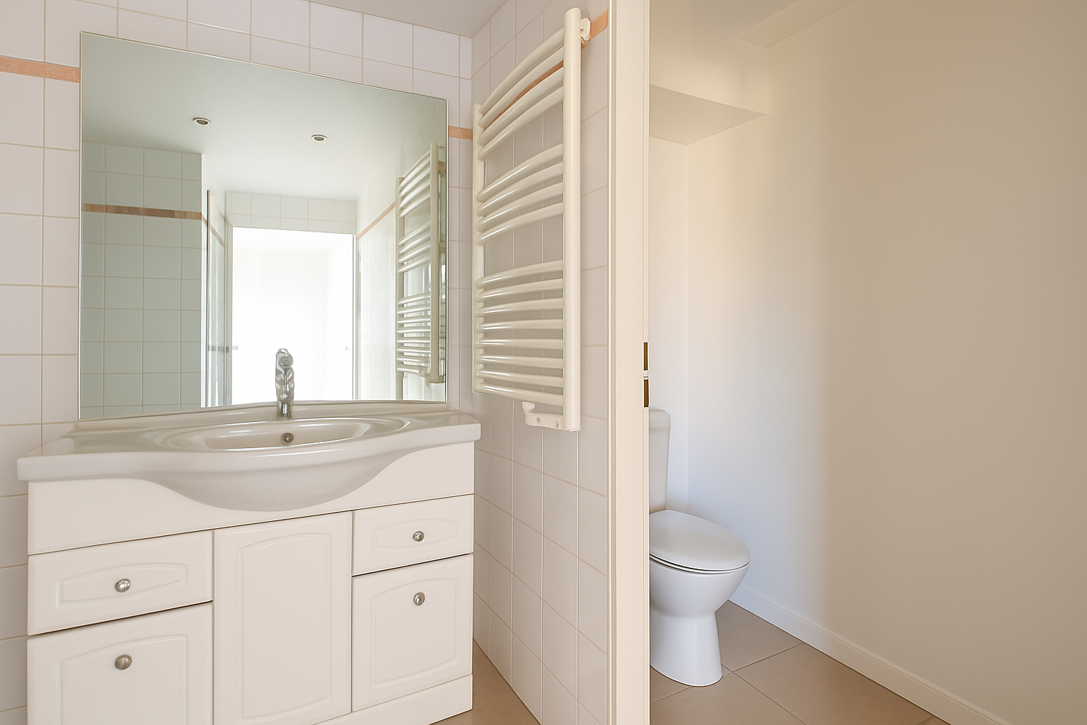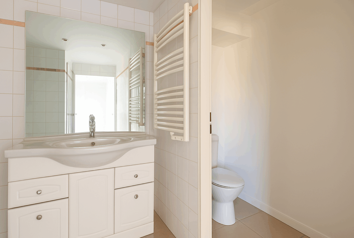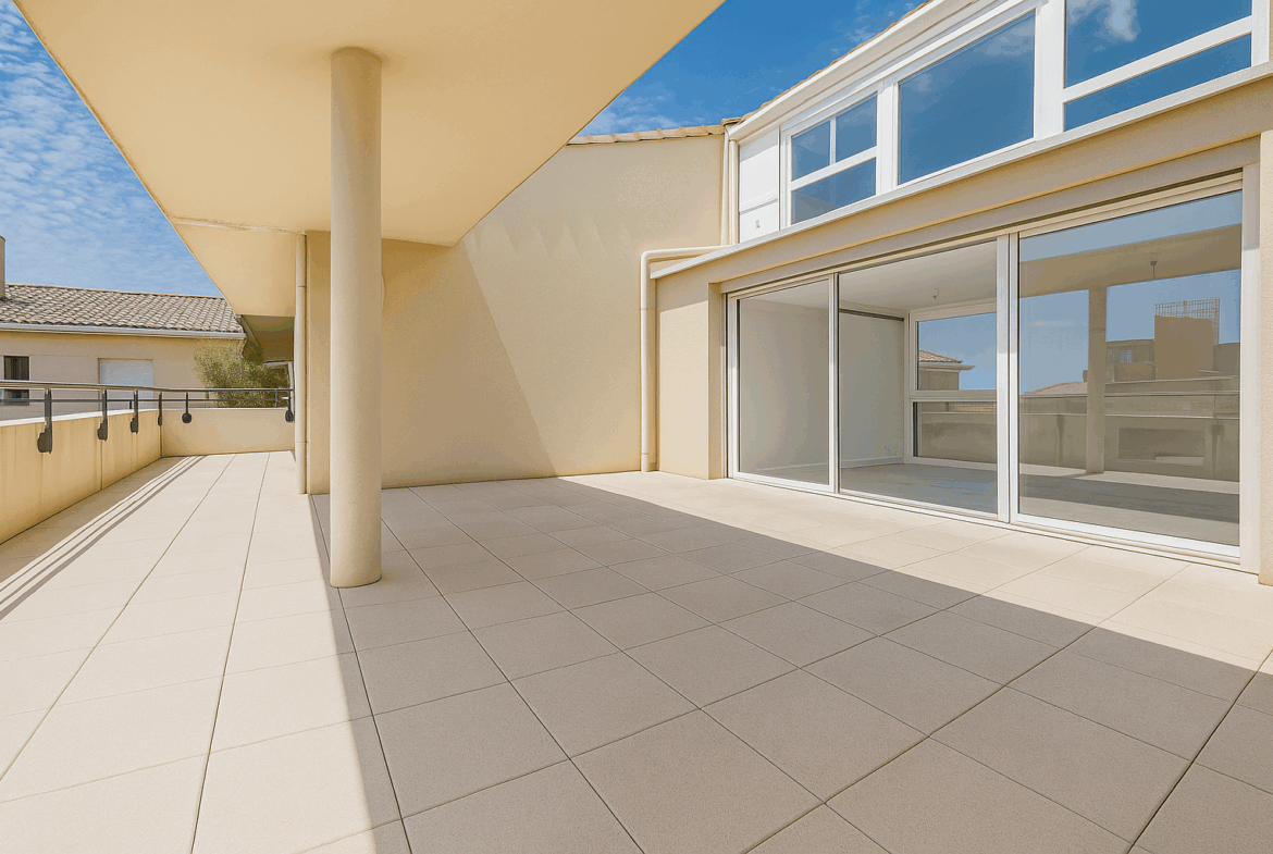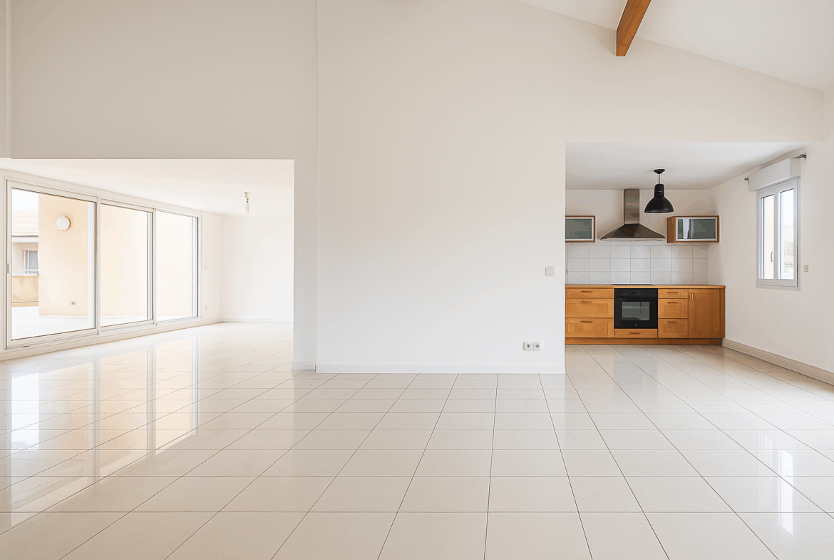 Accessible by elevator with direct access to the apartment, the apartment boasts double exposure and high ceilings. The vast cathedral living room of over 100 m², bathed in light, opens onto the terrace through large bay windows. The kitchen, open to the living space, creates a convivial, contemporary setting.