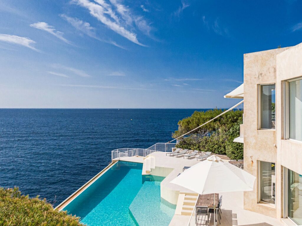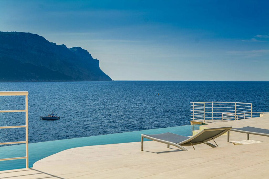 Nicolson Realty presents an exclusive waterfront property with private access to the sea in Cassis, on the peninsula side, on the front line facing the sea. Unique location just a few steps from the Roches Blanches hotel. The villa was built in 2001 by the architectural firm Puvieux & D’Ortoli. The single-storey, flat-roofed house recalls the timeless, sought-after allure of modernist homes from the 1950s. Its terrace and spectacular infinity pool were carved out of the rock, overlooking the sea. The villa offers a rare quality of view and quality of life. Close by, yet sufficiently overhanging to enjoy all the advantages of such a location. In addition to the property, possibility of a berth in the port. The house can be enlarged from 3/4 to 5/6 bedrooms in over 300 M2. Additional photos, plans and 3D enlargement project available on request.