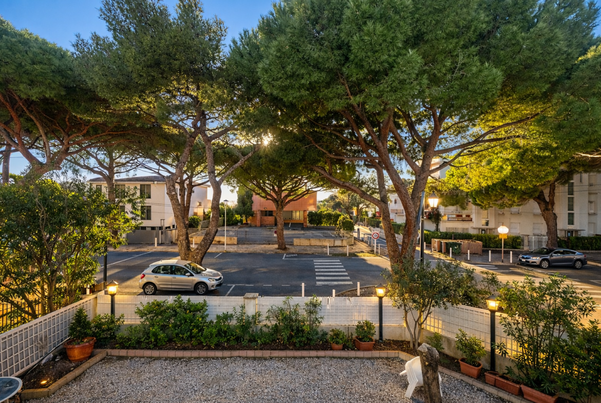 Le jardin, exposé plein Sud, fait face à la façade principale et bénéficie de l’ombre des pins parasols centenaires.
