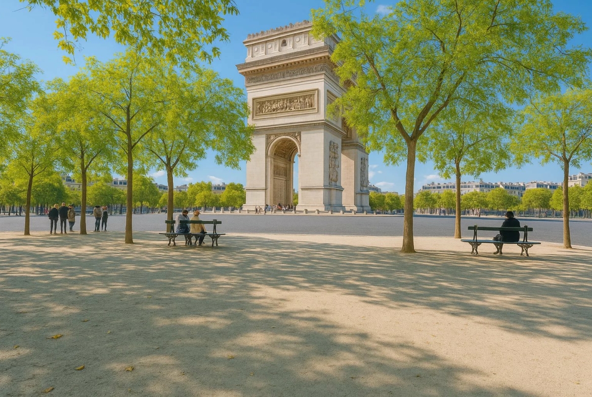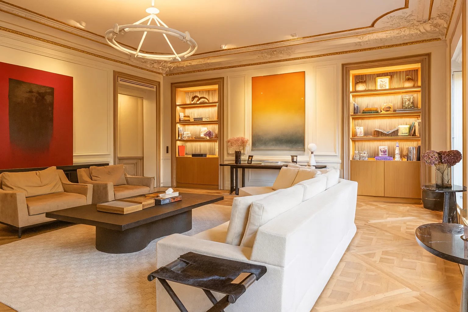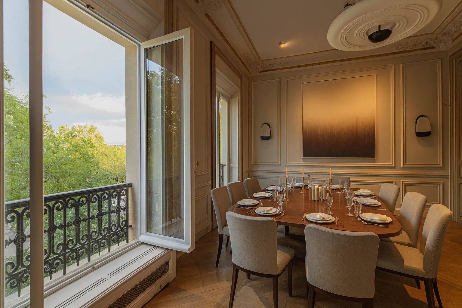 Un vaste séjour de plus de 50 m² prolonge l’expérience vers une salle à manger attenante, formant un ensemble harmonieux largement ouvert sur la Place de l’Étoile et offrant une vue imprenable sur l’Arc de Triomphe.