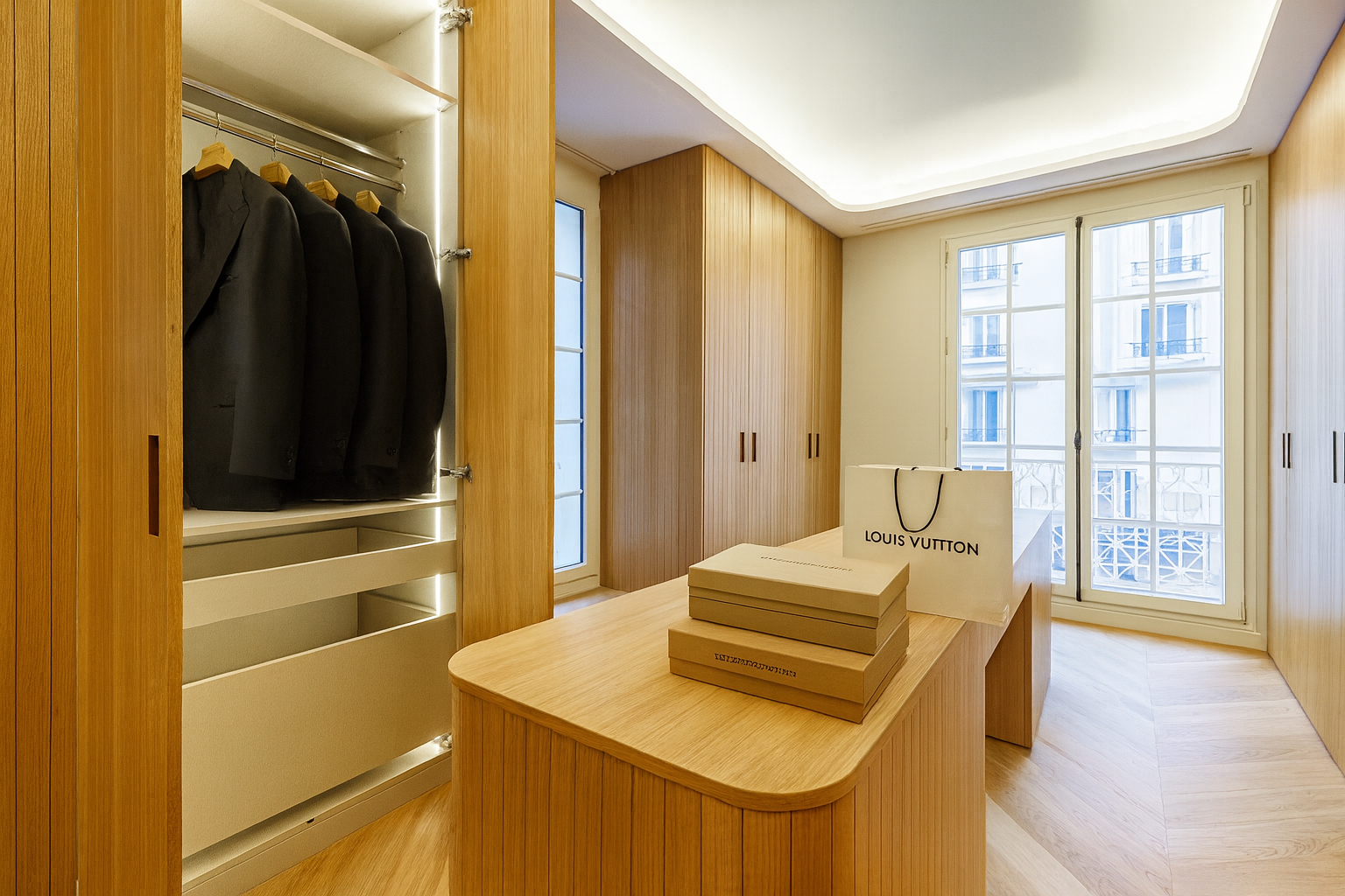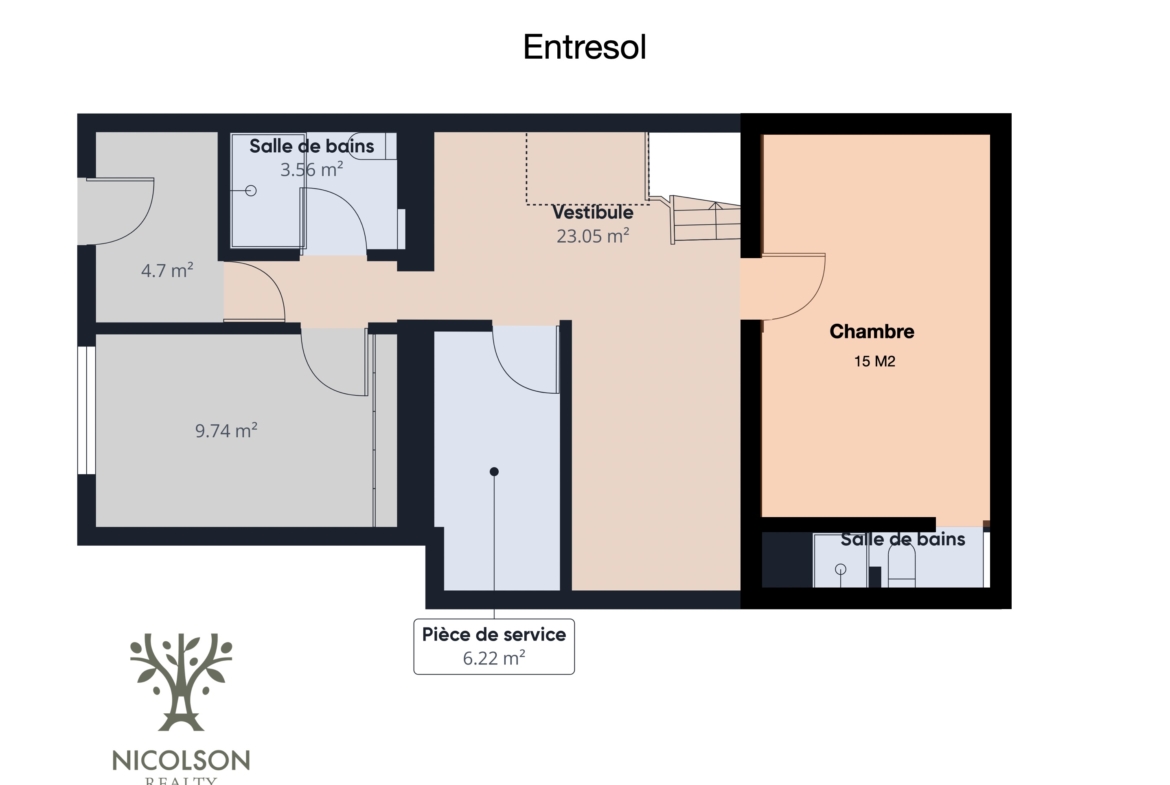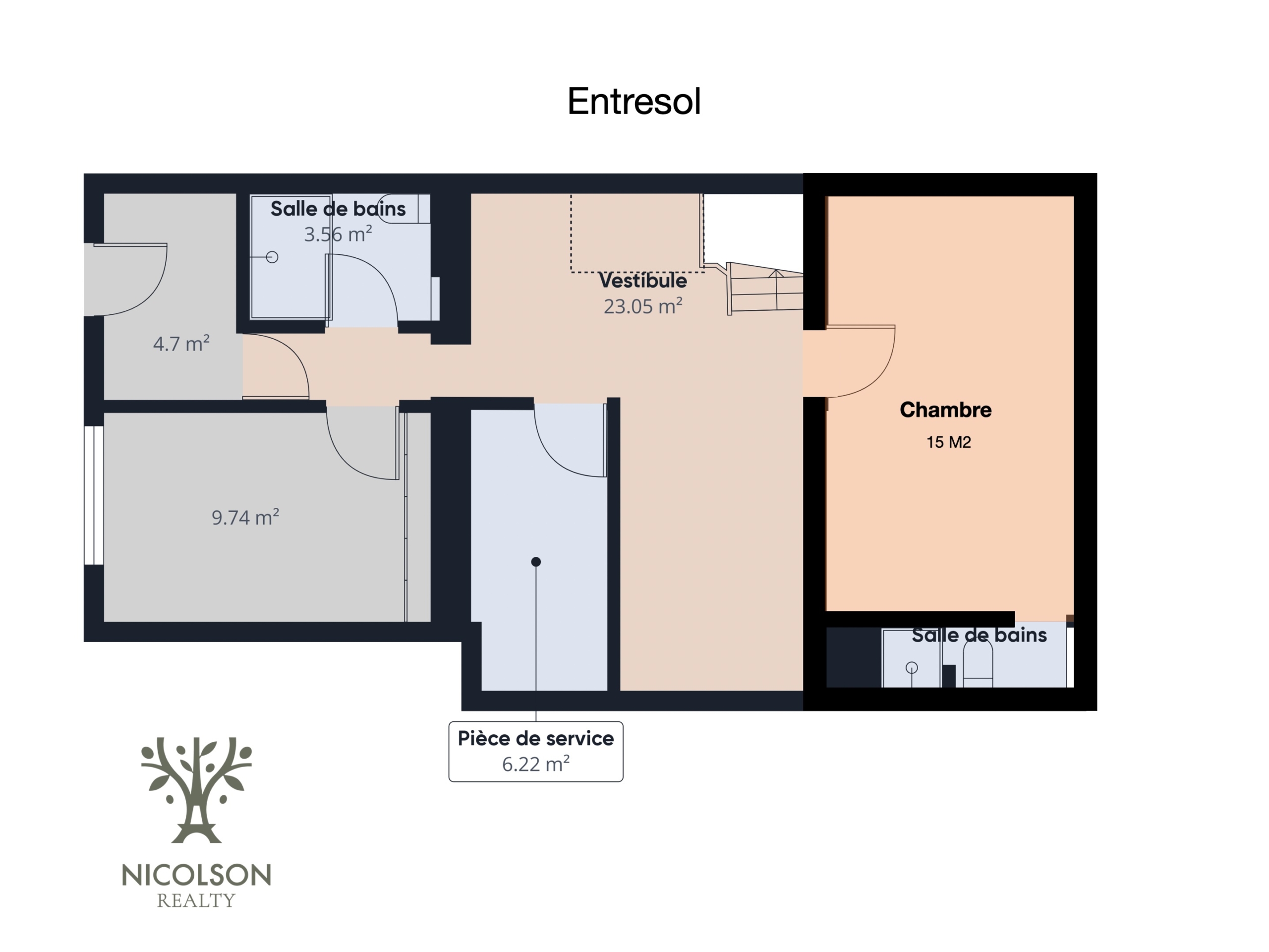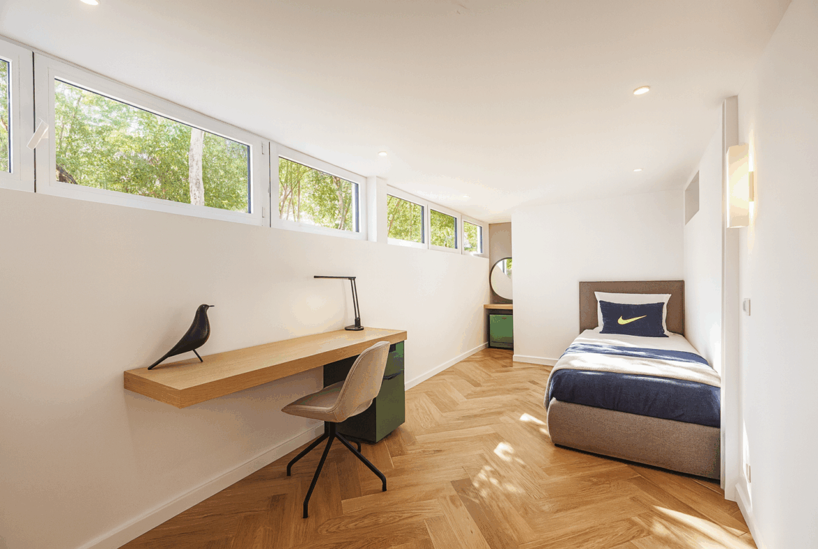 L’entresol a été pensé pour offrir une grande flexibilité : une chambre côté jardin avec salle d’eau et toilettes, un espace généreux pouvant être aménagé en bibliothèque, home-cinéma ou salle de jeux, ainsi qu’une chambre supplémentaire aménagée en studio indépendant avec accès privatif.