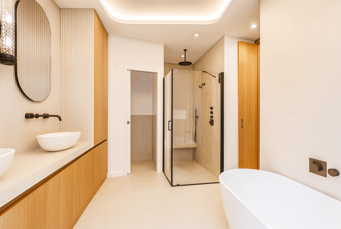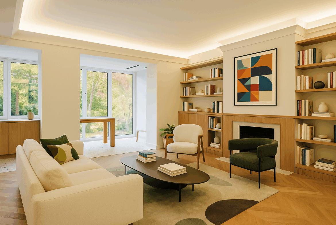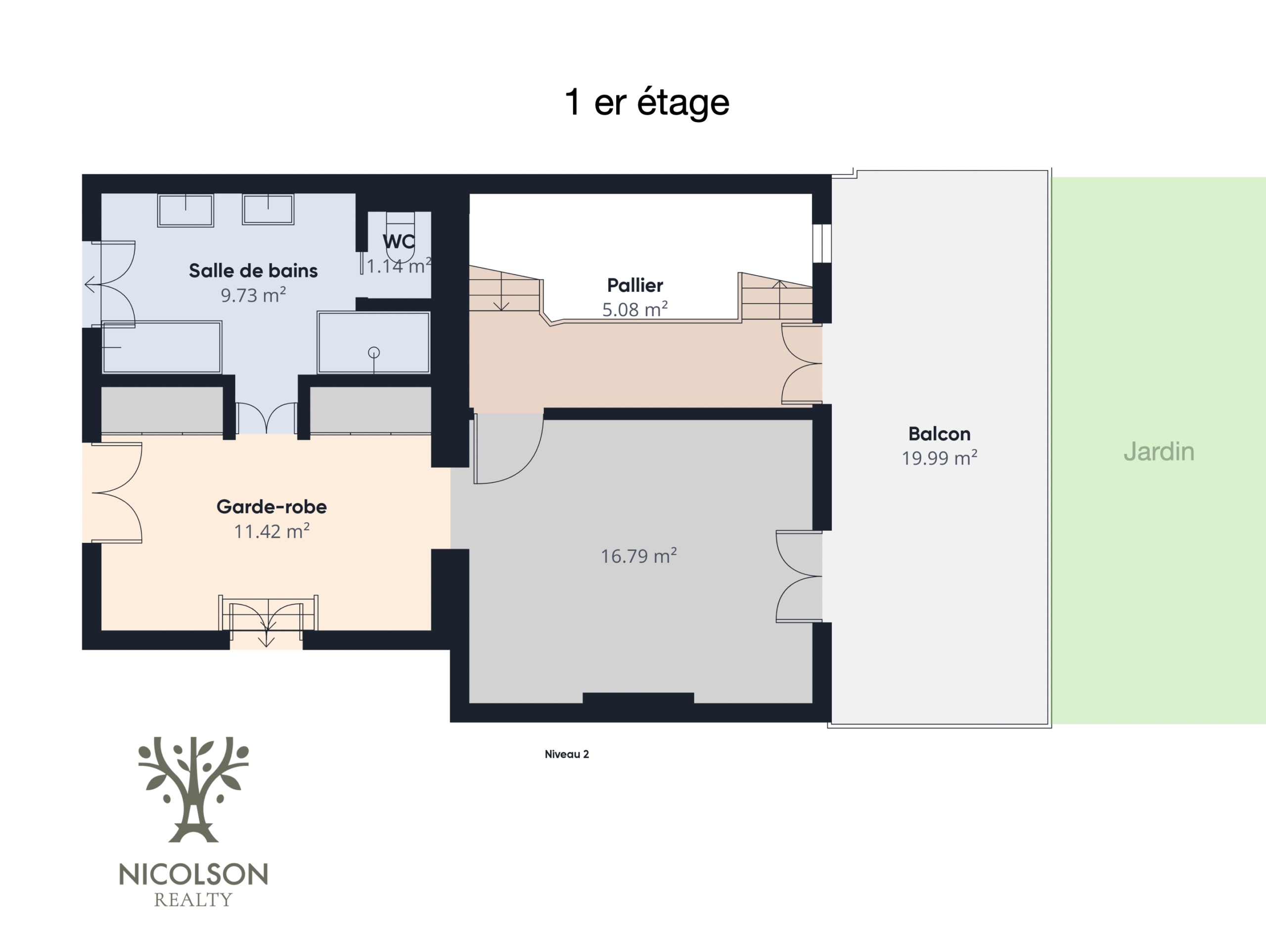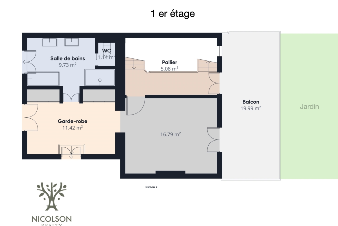 L’entresol a été pensé pour offrir une grande flexibilité : une chambre côté jardin avec salle d’eau et toilettes, un espace généreux pouvant être aménagé en bibliothèque, home-cinéma ou salle de jeux, ainsi qu’une chambre supplémentaire aménagée en studio indépendant avec accès privatif.