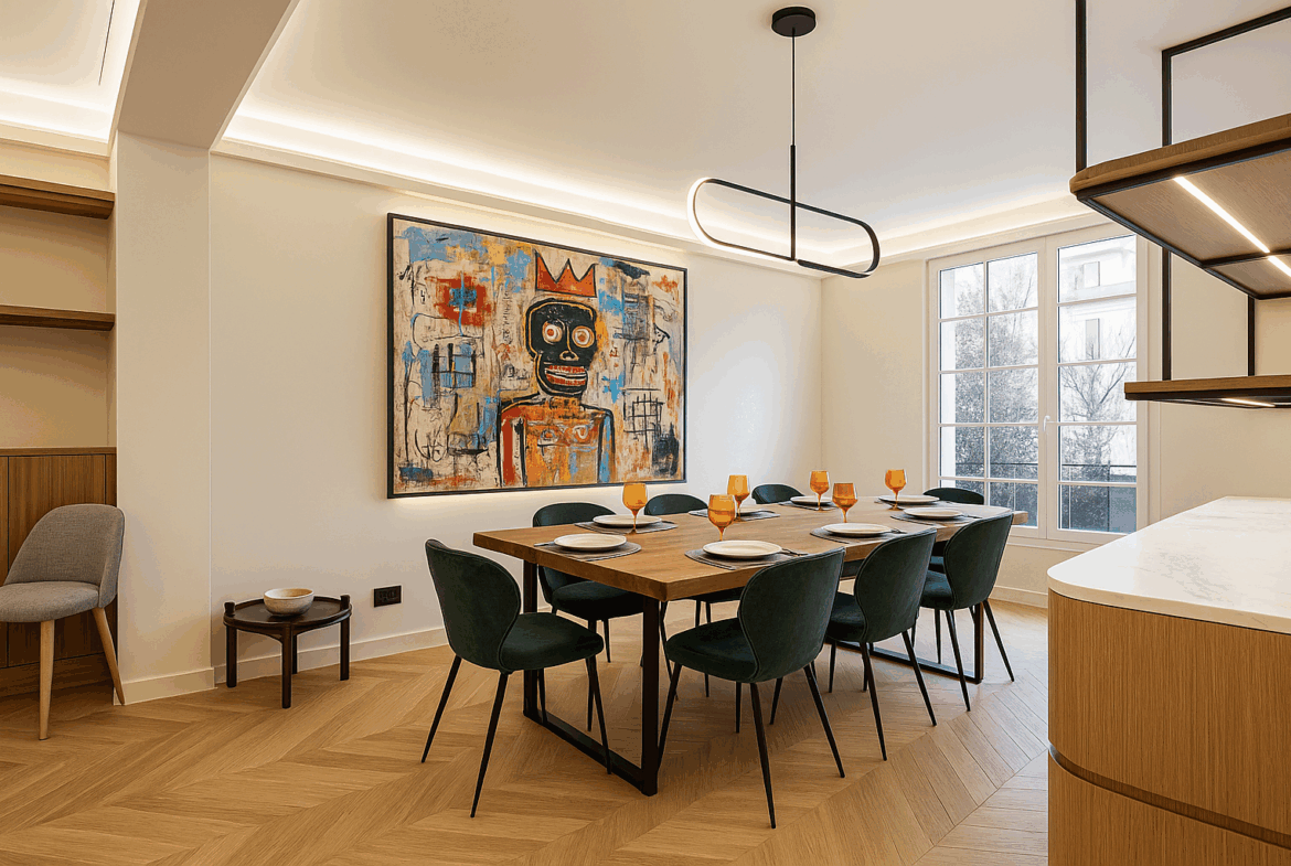 Au rez-de-jardin, les espaces de réception – séjour avec cheminée et parquet, salle à manger – s’ouvrent sur environ 50 m² baignés de lumière. Une cuisine contemporaine avec bar, d’environ 20 m², communique harmonieusement avec le salon et s’ouvre sur le jardin grâce à de larges baies vitrées.